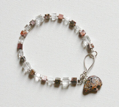 De armband is gemaakt met kubusjes van Swarovski kristal, Luipaardjaspis en zilver. Het Zuni Beertje is ook van Luipaardjaspis.